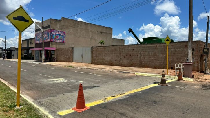 No momento, as equipes estão atuando diretamente na via, realizando a pintura dos quebra-molas e a instalação das placas de sinalização, garantindo que a nova estrutura esteja devidamente identificada e dentro das normas de trânsito.