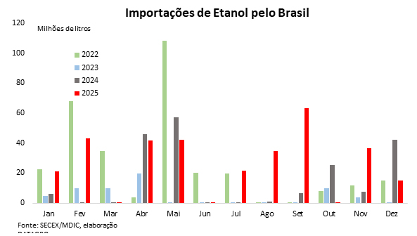 Por outro lado, as importações brasileiras de etanol registraram forte crescimento em 2025, totalizando 319 milhões de litros, avanço de 66,2% frente a 2024 e o maior volume importado desde 2021. Do total adquirido, 43,9% tiveram origem nos Estados Unidos, 29,9% no Paraguai e 26,2% na Argentina, segundo a SECEX.