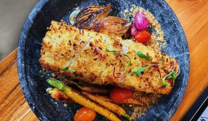 Bacalhau com creme de alho poró e cobertura crocante