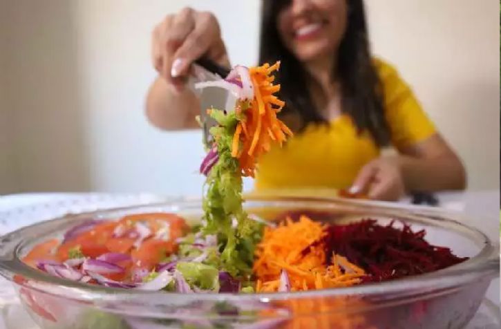 Priscila de Oliveira faz refeição baseada em salada e carne. (Foto: Paulo Francis)