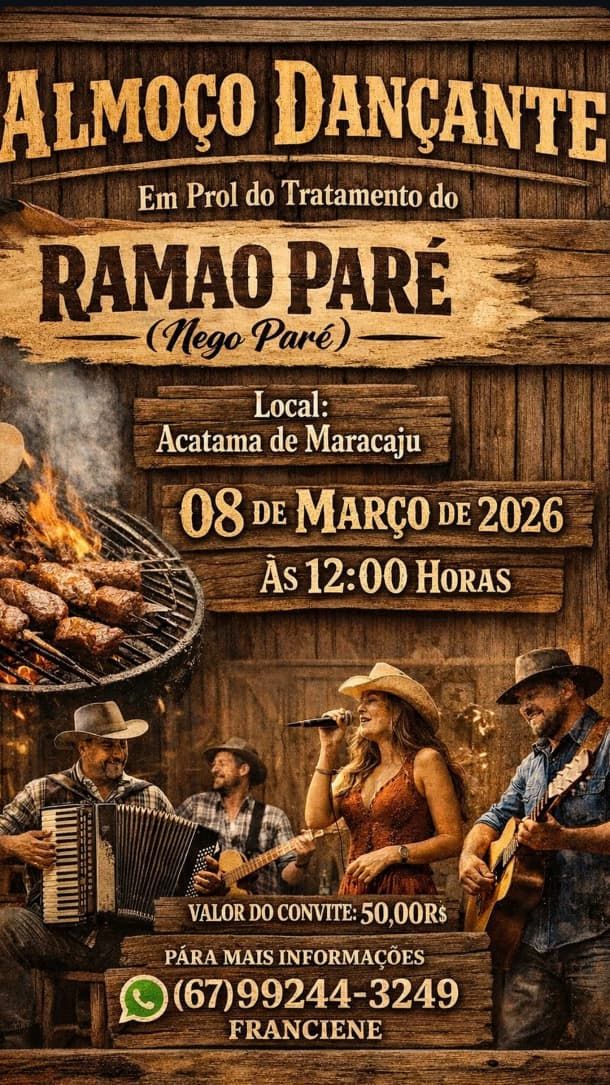 Um gesto simples pode fazer grande diferença na vida de quem enfrenta um momento delicado. No dia 08 de março de 2026, Maracaju será palco de um Almoço Dançante Solidário, em prol do tratamento de Ramão Paré, carinhosamente conhecido como Nego Paré.