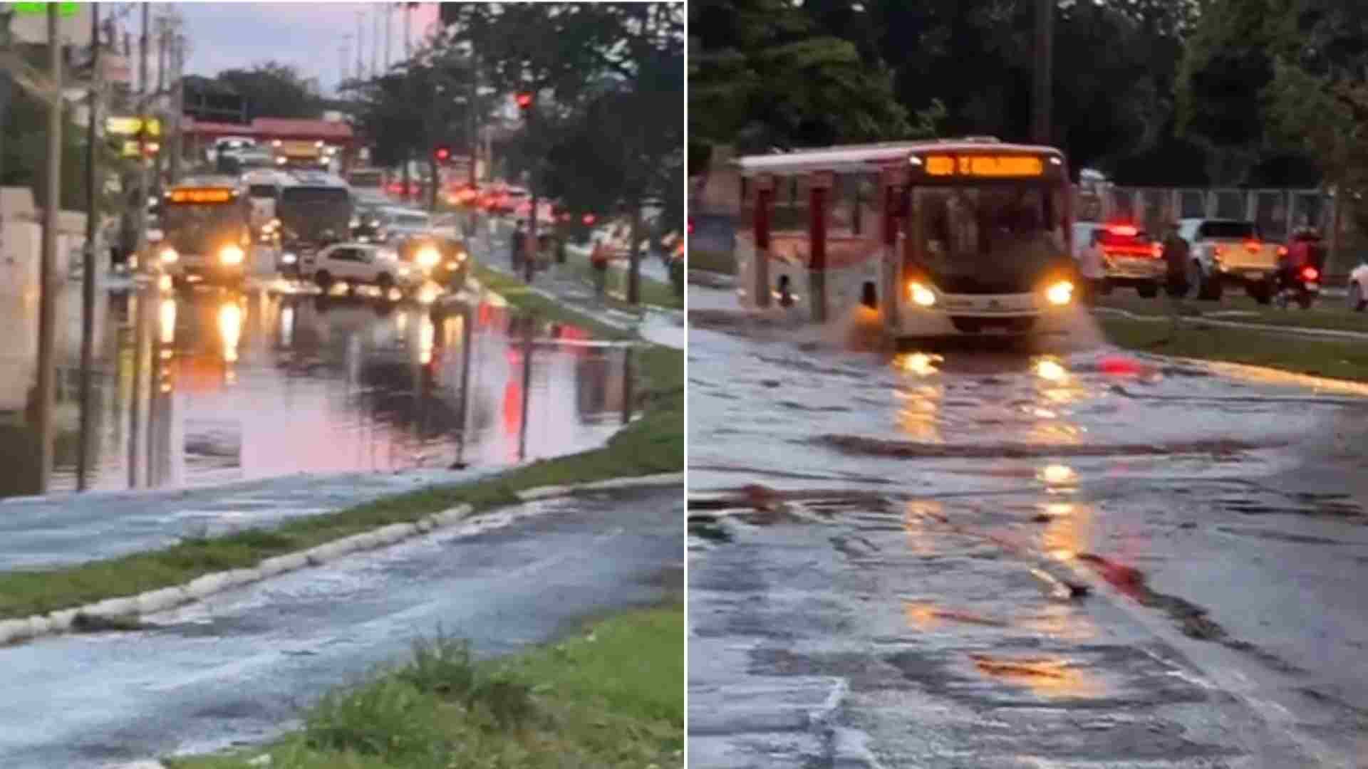 As imagens mostram condutores e até motociclistas se arriscando ao atravessar a enxurrada.