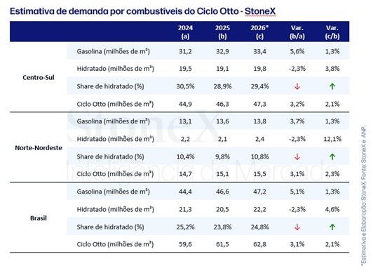 A StoneX, empresa global de serviços financeiros, revisou para cima suas projeções para o Ciclo Otto em 2026 e estima que o consumo total de combustíveis leves supere 62,8 milhões de m³, crescimento de 2,1% na comparação anual. A perspectiva mais positiva reflete um ambiente macroeconômico mais favorável e o aumento esperado da competitividade do etanol ao longo do ano.