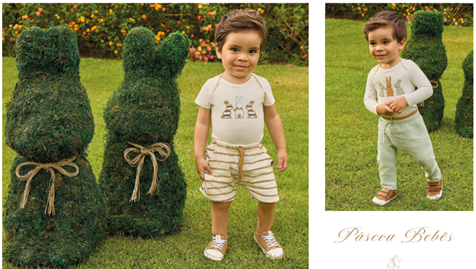 Para os meninos, os conjuntos também ganham destaque na coleção, com a paleta de cores claras, como cinza, branco e verde orvalho. Para as crianças menores, as opções incluem uma jardineira, com bordados de coelho e um body de manga longa com gola polo, deixando as combinações ainda mais delicadas.