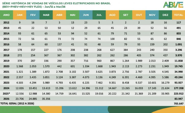 As vendas espetaculares de veículos leves eletrificados em março – 35.356 unidades – já refletem o otimismo do mercado de eletromobilidade com a nova norma sobre recarga elétrica em edifícios residenciais no Estado de São Paulo, segundo avaliação da ABVE. Os 35.356 emplacamentos assinalam um novo recorde de vendas mensais da série histórica da ABVE. Esse total é 42% acima dos números de fevereiro (24.885) e 146% superior aos de março de 2025 (14.380).