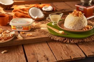 - Assim que retirar o cuscuz da cuscuzeira, espalhe sobre ele a Deline Cremosa. Decore com as fitas de coco queimado e, se desejar, regue com leite condensado. Sirva ainda quente.