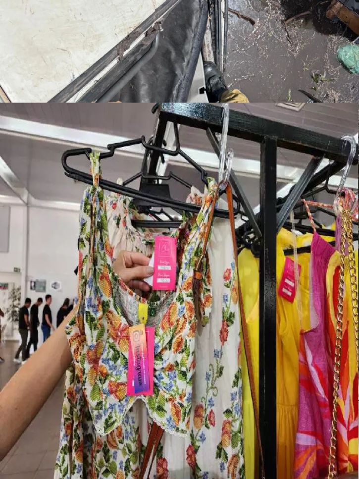 Um dos destaques foram as peças com etiqueta rosa, que indicavam roupas de marca e de valor mais alto. Nesses casos, a equipe faz uma pesquisa de preços para comparar com o valor original da loja e mostrar a diferença do produto com o desconto.