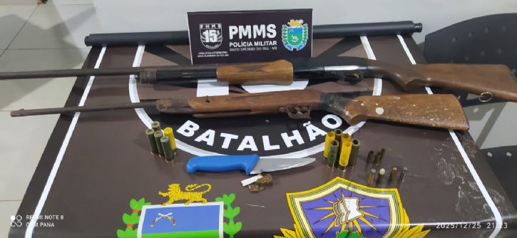 Diante dos fatos, os policiais realizaram a abordagem e deram voz de prisão ao autor. Durante buscas na residência, foram localizadas duas armas de fogo, ambas com numeração raspada, sendo uma espingarda calibre .20 e uma arma calibre .22 modificada, além de munições de diversos calibres, uma faca de aproximadamente 26 centímetros e uma porção de substância análoga à maconha, com cerca de 10 gramas.