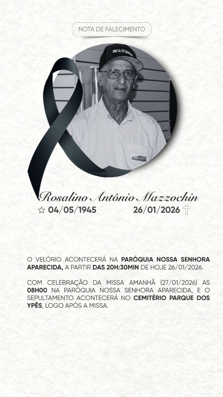 Faleceu nesta segunda-feira (26), aos 80 anos, em Maracaju, o empresário Rosalino Antônio Mazzocchin, um dos empresários que foi fundador da Bica d’Água Materiais de Construção, estabelecimento conhecido e respeitado na cidade.