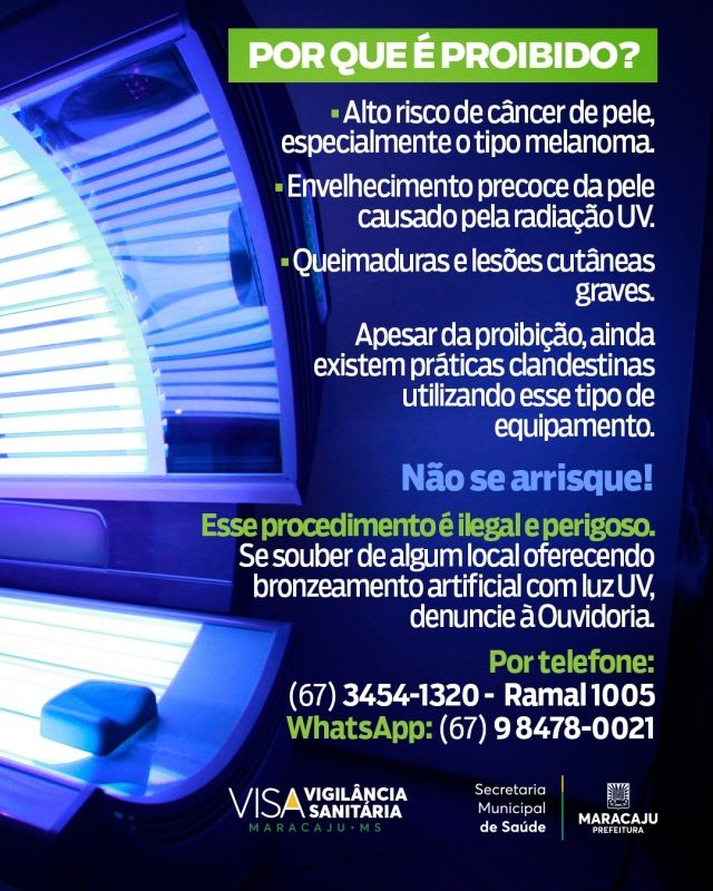 A Vigilância Sanitária de Maracaju, conforme a legislação federal, reforça a proibição do uso de câmaras de bronzeamento artificial com radiação ultravioleta (UV) em todo o território nacional. Essa medida, respaldada pela Resolução de Diretoria Colegiada - RDC n.º 56, de 09 de novembro de 2009, publicada pela Anvisa, visa proteger a saúde da população contra os riscos do uso desses equipamentos, classificados pela Organização Mundial da Saúde (OMS) como cancerígenos para os seres humanos.