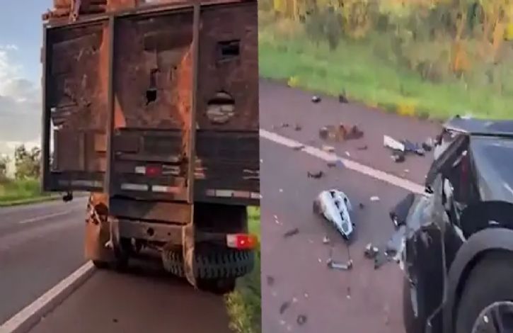 O utilitário seguia pela rodovia quando acabou atingindo a traseira do caminhão que transportava a carga de madeira. Com a força do impacto, a parte dianteira do SUV ficou completamente destruída.