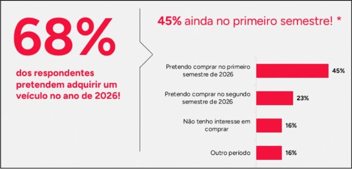 A Webmotors acaba de revelar os dados de sua Pesquisa de Intenção de Compra. Em sua quarta edição, o levantamento aponta que 68% dos brasileiros pretendem adquirir um veículo em 2026, sendo que 45% do total de respondentes planeja realizar a aquisição ainda no primeiro semestre de 2026. A pesquisa do Webmotors Autoinsights, ferramenta que fornece dados e informações sobre o mercado automotivo brasileiro, colheu as respostas de mais de 1,8 mil brasileiros entre novembro de 2025 e fevereiro de 2026.