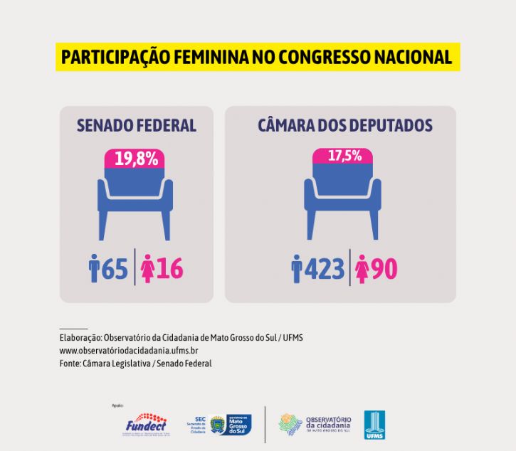 O Observatório da Cidadania de Mato Grosso do Sul realizou um levantamento de dados sobre a participação feminina na política, reunindo informações das esferas nacional, estadual, municipal e internacional, com base em indicadores do IBGE, da Câmara dos Deputados, do Senado Federal, da Assembleia Legislativa de Mato Grosso do Sul, do Observatório Nacional da Mulher na Política e de organismos internacionais.