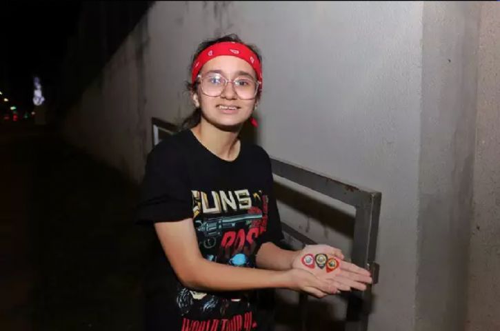 Após dois dias de espera e muita frustração por ter perdido o show, a pequena Manoela Rodrigues, de 12 anos, teve uma recompensa. Conseguiu abraçar o baterista Isaac Carpenter e o guitarrista Richard Fortus da banda Guns N' Roses. Também ganhou palhetas de presente. O encontro aconteceu na tarde desta sexta-feira (10), em frente ao hotel onde os artistas estão hospedados, nos altos da Avenida Mato Grosso.
